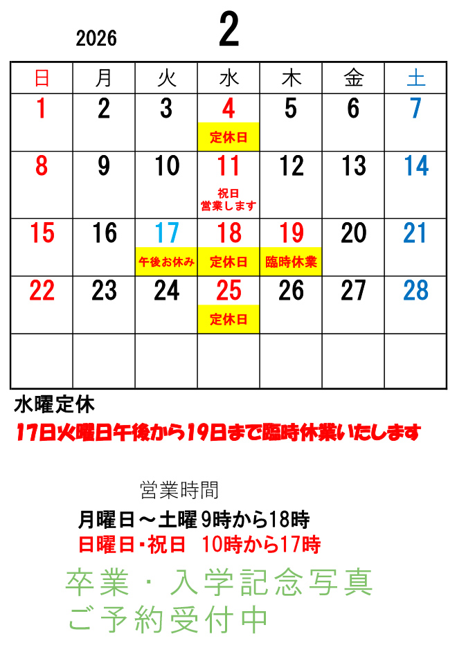 2月17日午後から2月19日まで臨時休業いたします。