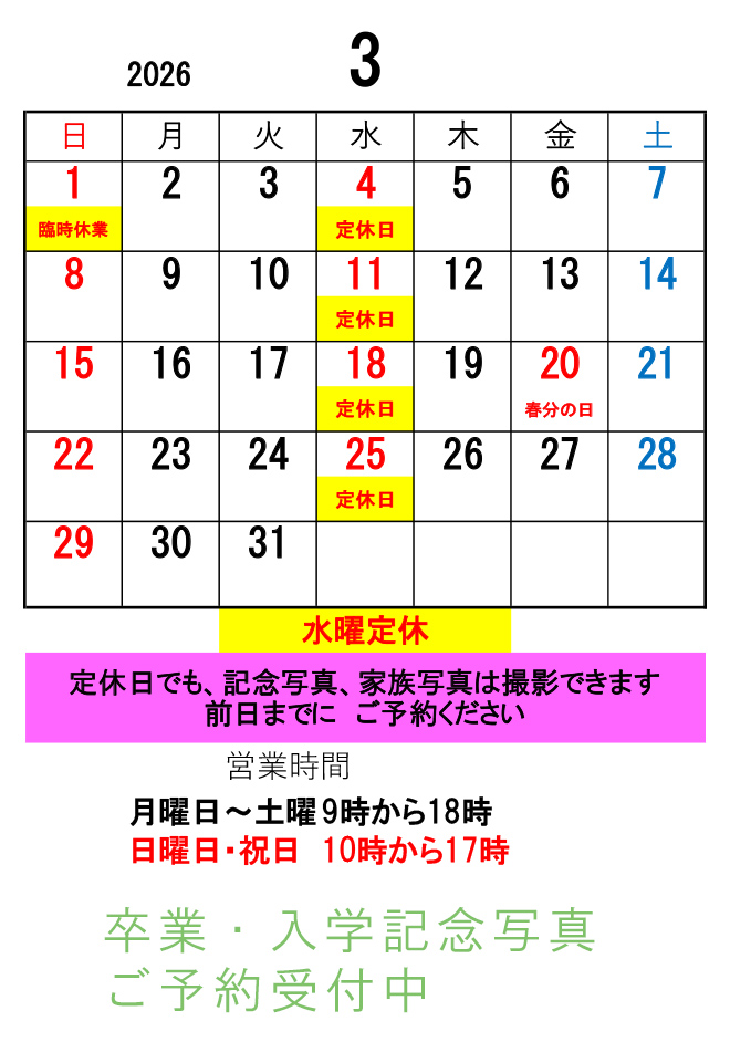 定休日でも、卒業記念など、記念写真の撮影出来ます。前日までにご予約ください。